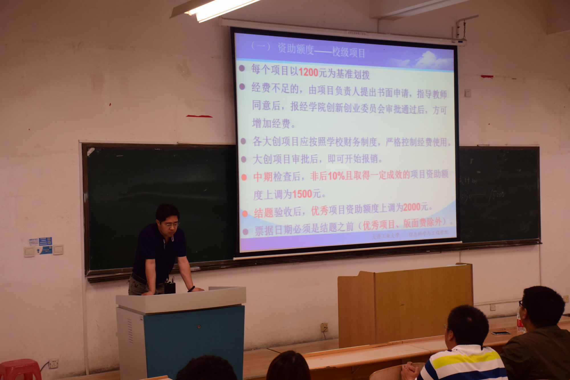 接着,于晓强院长为2017年度立项的大创项目组详细说明了大创经费使用的注意事项以及结题报销的操作流程。于院长肯定了我院大创项目所取得的优秀成绩,同时也指出了不足之处。他阐述了大学生积极参与创新创业项目的必要性及重要意义,同时强调了开展大创项目必须秉持的科学、严谨、认真、负责的态度。通过此次说明会,项目指导教师及项目组学生成员深受启发,理解了创新的意义,明确了今后项目开展的方向。